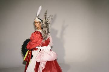 El resultado se articula como un ejercicio de upcycling por capas, donde la prenda funciona como un collage técnico. En el delantero conviven tejidos extraídos de capas y abrigos de ediciones previas —como el mikado rojo de 2016 o el tafetán rosa tiza de 2017— junto a aplicaciones de cristal vinculadas al primer vestido que Hervé Moreau realizó para Pronovias. A ese entramado se suman piezas negras y un lazo procedentes del look de 2019, y elementos reaprovechados del primer vestido que lució en La Sexta, firmado por Charo Ruiz.