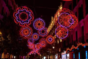 “Para diseñar la iluminación de calle Arenal decidí inspirarme en el barrio de Madrid donde se albergaban en el siglo XVII todos los talleres artesanales”, desde los de hiladores, bordadores o guarnicioneros, explica por su parte el diseñador Moisés Nieto, reconocido recientemente por su parte con el premio Apoyo a la Artesanía de Madrid Craft Week como impulsor de la plataforma “La Hacería”. De este modo, “las piezas que iluminan la zona desde Sol hasta Ópera son grandes esferas que recuerdan a patrones circulares hechos en ganchillo”, indica el diseñador. Unas “labores artesanales utilizadas hasta hace poco para decorar la casa”, que han servido como motivo de inspiración para diseñar estos “minuciosos círculos en colores cálidos y vibrantes” que vienen iluminando estos días esta céntrica y concurrida calle del corazón de Madrid.