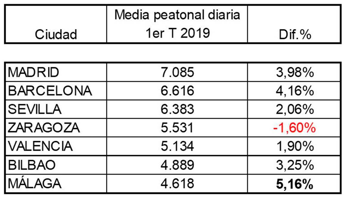 Por valores de flujo, el ranking lo sigue liderando Madrid con una media de 7.085 peatones diarios. Seguida de Barcelona (6.616), Zaragoza (5.531), Valencia (5.134), Bilbao (4.889) y Málaga (4.618).