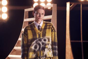 Como resultado, nos encontramos con una colección dominada por una fuerte estética “college”, en la que las características de las prendas de los uniformes estudiantiles para chico y para chica se fusionan. Mientras que en lo referente a los diseños y estampados, predominan los cuadros escoceses en combinación cromática de amarillo, gris y negro, con una permanente reinterpretación de las características faldas plisadas de los uniformes femeninos. Unos elementos más estereotipados, que van dando paso a medida que evoluciona la colección a unas propuestas más sobrias y versátiles, construidas sobre una combinación de tonalidades neutras a base de beis, blancos, grises y negros. Una contenida paleta cromática, que veremos como Chiuri es capaz de dotar de un gran dinamismo y atractivo visual, gracias a su magistral uso de unos nuevos materiales técnicos que entra a combinar con bordados, con prendas de punto y con tejidos propios de la indumentaria masculina. Todo ello al mismo tiempo que no duda en entrar a reinterpretar, una vez más, piezas icónicas del legado histórico de la marca, como su emblemática chaqueta “Bar”.