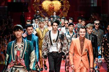 El actor estadounidense Will Peltz, el modelo británico Olivier Cheshire, Christian Combs, hijo del rapero estadounidense Puff Daddy, y Presley Gerber, hijo de la top model Cindy Crawford, fueron algunos de los invitados a desfilar. La casa italiana ofreció una colección fiel a su imagen con lentejuelas, telas brillantes, pedrerías y encajes. Para los hombres, eligió como tema principal el juego de naipes, estampando cartas como el rey de corazones en sus camisas, pantalones cortos o trajes. Las camisas de flores y los bermudas de seda completan un vestuario masculino bastante llamativo.