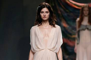 El dúo de diseñadores se centra en el desnudo del cuerpo como base para ir superponiendo tejidos semitransparentes y volátiles y velar esa primera realidad con sinuosidad vegetal donde la vegetación va dibujando orgánicamente las formas femeninas.