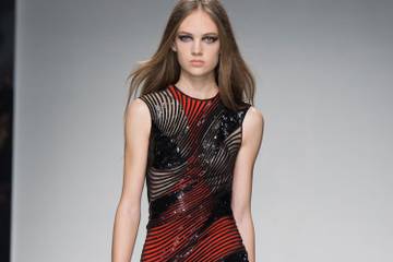El domingo de noche, Donatella Versace presentó siluetas de seductoras esculturales y muy seguras de sí mismas para la primavera-verano 2016. Los vestidos acompañan las curvas, el cuerpo se valoriza con bordados y redes brillantes evocan las telarañas. Los pantalones pegados al cuerpo estilo años 1980 se llevan con tacones stilettos y una pequeña chaqueta muy corta para un conjunto de impactante blancura.
