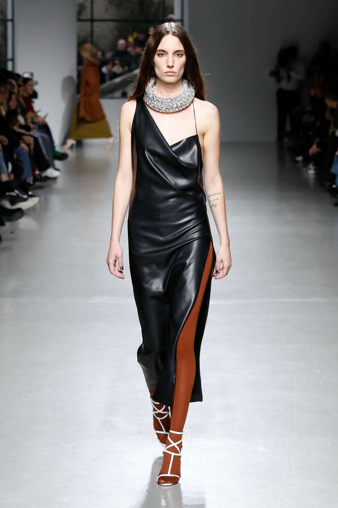 Un vestido de cuero negro de largo midi es otro artículo clave. Debe tener una silueta esbelta, una abertura lateral es opcional. El cuero puede ser liso o con estampado de cocodrilo. Los adornos apropiados incluyen cremalleras y ojales.
