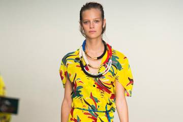 Look clave de Milán, esta tendencia veraniega recoge los estampados tropicales con colores vivos. Los pájaros exóticos se añaden a los fondos, como flores de hibiscos sobredimensionadas y deformadas con rayas. También se añaden formas abstractas de plantas acuáticas.