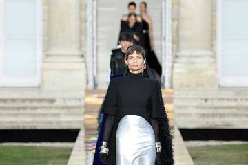 En el idílico patio de la Escuela de Bellas Artes de París, las modelos lucieron prendas de negro sedoso y elegante que se combina con un toque azul, ya sean unas plumas en el sombrero o un gran lazo a modo de cinturón.