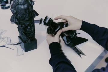 “Cuando me encargaron diseñar el zapato oficial de los Goya 2025 por parte de Hispanitas, fue todo un reto”, y para la hora de tratar de hacerle frente, “lo primero que pensé es que debía tener una vinculación directa con el cine”; “no podía ser un guiño sutil que no se entendiese, demasiado conceptual o que estuviese inspirado en una sola película”, profundiza el mismo diseñador valenciano, “sino que a primera vista la referencia debía ser clara e intentar abarcar toda la filmografía posible”. En respuesta a esa serie de premisas con las que entró a trabajar como primer punto de partida, “me fui instintivamente a lo más básico, el celuloide”, a “la cinta plástica que recoge fotograma a fotograma cada una de esas películas que tanto hemos disfrutado desde el comienzo del cine”, para aportar el toque distintivo a esta pieza, elevada a la categoría de obra de arte por su singularidad. “Me produce una alegría inmensa haber tenido la oportunidad de crear esta pieza”, añade Vidal, un diseño “que pienso abre el camino a la creatividad vinculada a una de mis mayores pasiones que es el cine y el arte”.