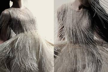En cuanto a los tejidos y la materialidad de esta última colección, destacarán la presencia de ligeras sedas naturales y de tejidos técnicos con apariencias de lana o pelo. Pedrerías y bordados en tejidos poco habituales, y adornos como flecos que se encargan de dotar a algunas prendas de una importante sensación de movimiento. En cuanto a los colores, además del tradicional blanco, veremos vestidos teñidos en tonos camel, marrones y chocolates.