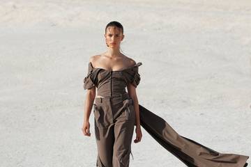 Recurriendo como motivos de inspiración a la figura y a las obras de los hermanos Diego y Alberto Giacometti, pareja de artistas suizos que se destacaron dentro del mundo del arte gracias a sus esculturas y pinturas de desnuda naturaleza plástica, desde Jacquemus han presentado una sucesión de prendas construidas a partir de linos y de otra buena sucesión de tejidos, todos ellos de apariencia natural y desinhibida. Materiales que encontraremos reunidos en torno a una sobria paleta cromática armada a base de blancos, marrones arenas y negros, junto a livianos acentos de color en azules y ocres, construyendo así en su suma las bases que vienen a reforzar la naturaleza de la propia colección como una suerte de lienzo ondeante modelado por el viento.