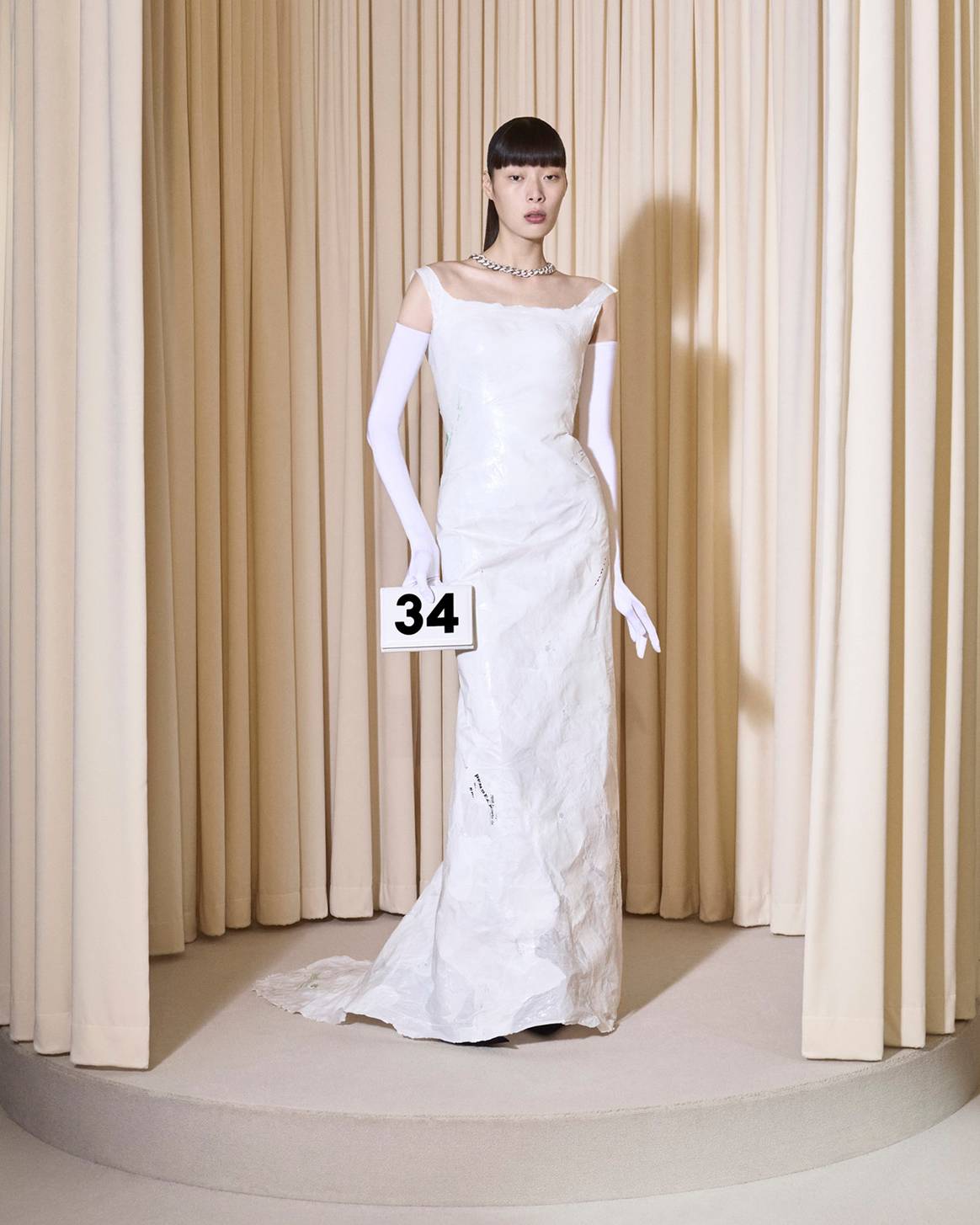 Si esta serie de piezas ya dan buena muestra de la excelente producción que se oculta tras cada uno de los diseños de esta colección, ahondando sobre esto mismo, cada una de esas desaliñadas prendas urbanas que forman parte de esta colección, realmente se encuentran forradas en su interior en satén de seda. Un ejercicio que permite terminar de realzar sus formas, y que vuelve a retrotraernos a ese ejercicio primoroso, y oculto, que se oculta tras cada una de las piezas de archivo diseñadas por Cristóbal Balenciaga. Figura cuya alargada sombra así pues sobrevuela a lo largo de cada uno de los elementos que integran esta colección, sobre la que también es de necesidad subrayar como piezas clave al vestido blanco de corte columna, confeccionado a partir de bolsas de plástico derretidas y recicladas; al vestido de cuero, creado de una sola pieza y sin costuras, sujeto desde un gran imperdible; al vestido de aluminio dorado sujeto a la femineidad del cuerpo de quien lo porte; al elegantísimo vestido de pieles, sintéticas, pero confeccionado en el tradicional patrón en espiga y siguiendo con los métodos artesanales de la industria peletera; o, como broche de oro además de la colección, y del desfile, a un “efímero” vestido globo, cuyos volúmenes y pliegues parecían hacer referencia a dos de las construcciones más emblemáticas de Cristóbal Balenciaga, a sus vestidos en corte globo y a sus vestidos en corte de rosa.