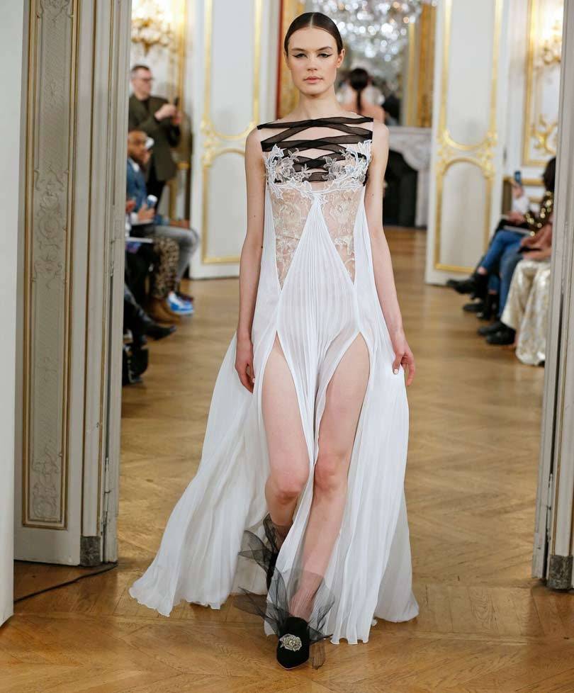Los vestidos ceñidos y transparentes de tul recuerdan los vestidos de novia de Yolancris, con sus encajes delicados. Otro, con escote palabra de honor, combina plisados dorados. Otro de falda voluminosa con corpiño ajustado mezcla el blanco y el negro con motivos florales pintados a mano.