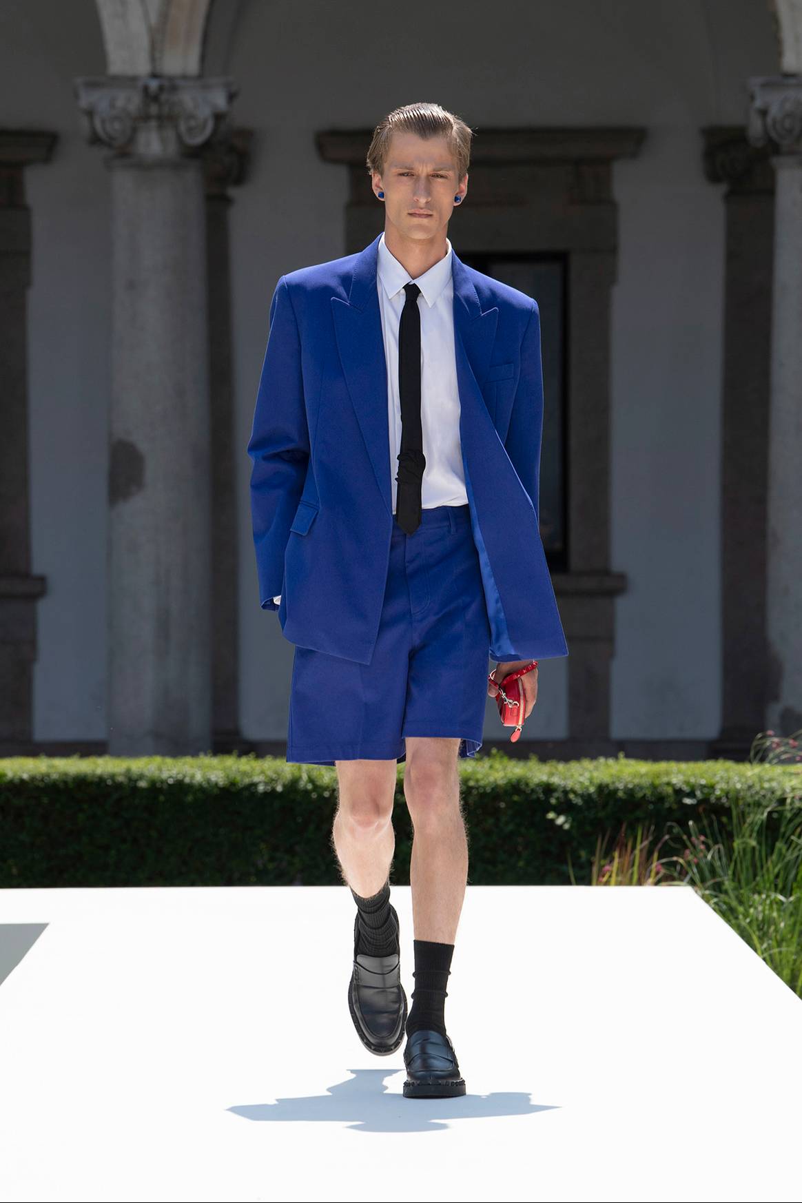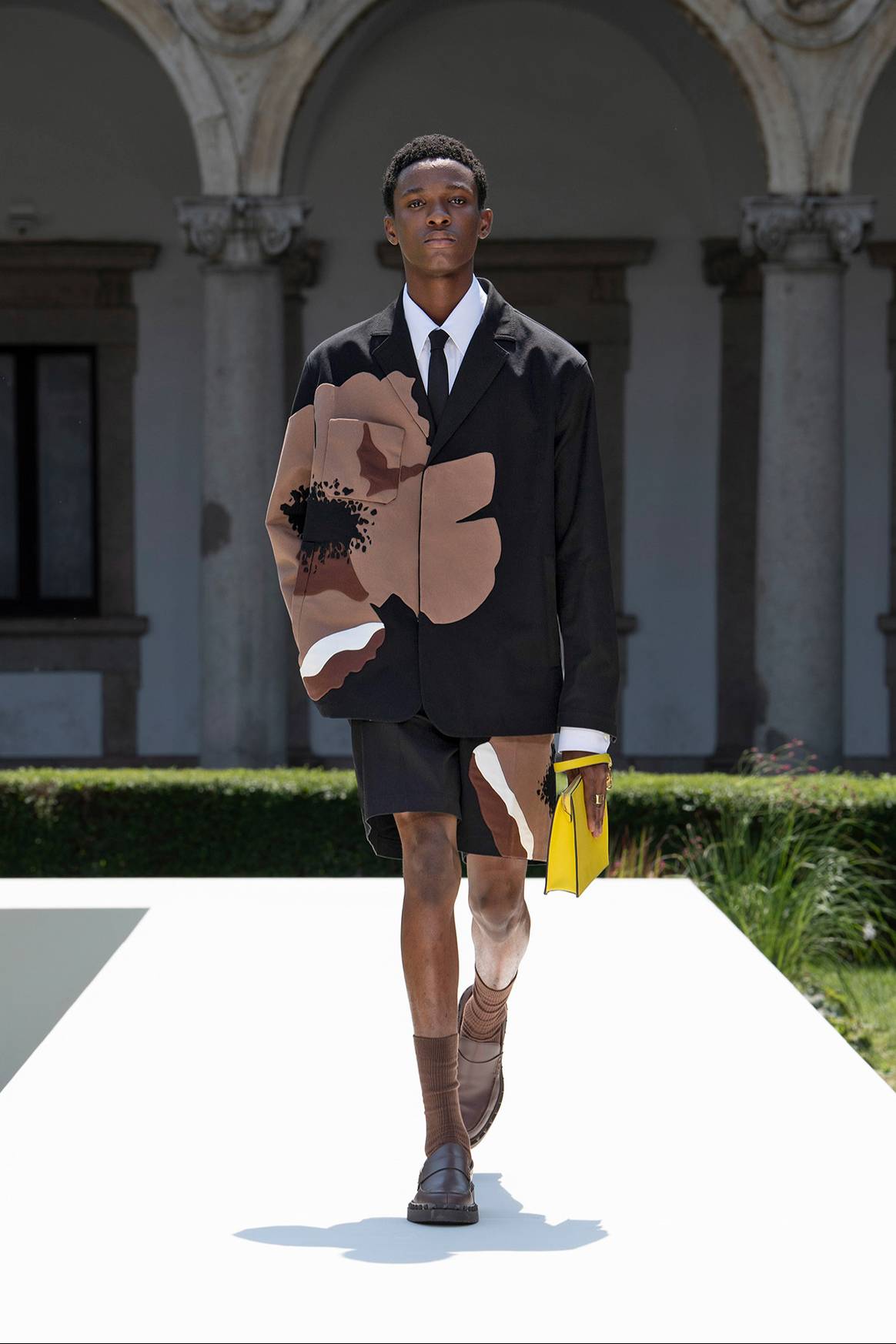 Sobre este espectro cromático, terminaban por desfilar desde el patio de la Universidad de Milán unas piezas bien arraigadas en los principios de la sastrería masculina, contextualizada y adaptada eso sí a los actuales tiempos modernos. Un ejercicio no carente ni mucho menos de talento, pero que eso sí, y en línea con lo apuntado, terminaba devolviendo la imagen de prendas y de unos estilismos ya vividos, y que no terminaban de hablar de la identidad de ningún nuevo “hombre Valentino”, o no de al menos de ninguno con algo realmente interesante que contar, en cuanto a estética se refiere. Un “frío” interés que resultaría en parte también como consecuencia de que, lejos de terminar de poner el foco en esa aproximación entre lo masculino y lo femenino que ya le deseamos a todo ejercicio que trate de dibujarnos unas nuevas identidades masculinas, la casa ha terminado en contra por depositar su atención en, primero, tratar de borrar el carácter elitista de la sastrería —algo muy difícil de defender desde la posición de una casa de modas como Valentino enfocada al sector del lujo—, y segundo, de rejuvenecerla dotándola de notas aniñadas.