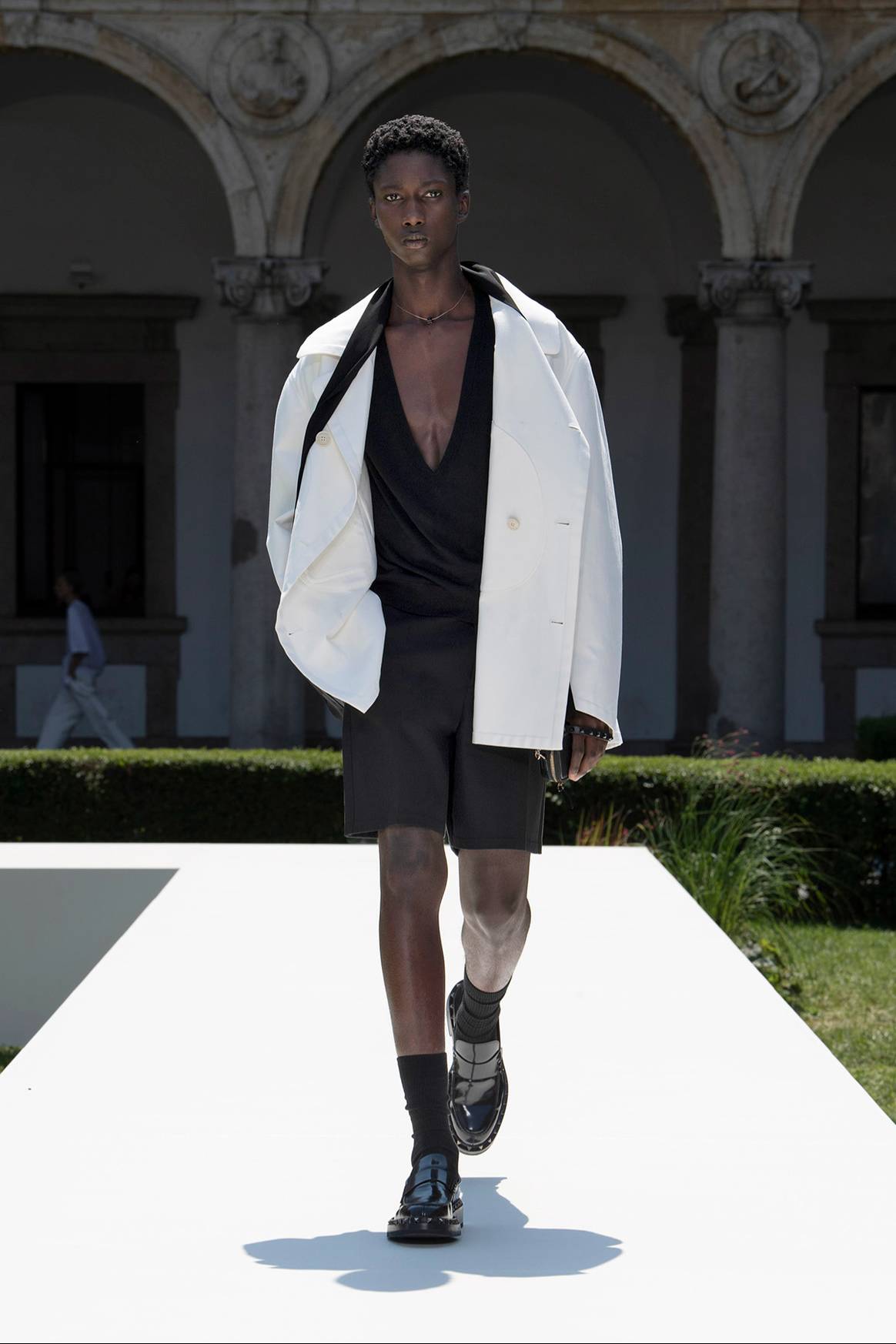 “Trabajar dentro de los límites de las tradiciones permite cuestionar las convenciones, romper las reglas, activar cambios desde dentro”, defienden desde Valentino, en unas afirmaciones con las que parecen venir en parte a justificar la tibieza ejercida sobre esta colección, para unas intenciones que, podría ser o no, se mostrarían mucho más ambiciosas que las mostradas en esta ocasión. Así pues, y en lo que respecta a esta colección, “los contextos transformados pueden cambiar la percepción de que la sastrería, que alguna vez fue emblemática del poder y el éxito, ahora puede ser usada por una nueva generación como una expresión de individualidad”, apuntan en relación a esa supuesta “democratización” de la sastrería de la que parecen presentarse como garantes. Una nueva sastrería moderna, que presentan en forma de una combinación de americanas y de abrigos, que “se llevan con pantalones cortos”, con lo que “se suavizan y se hacen más informales, añadiendo una nota joven y enérgica”. “La prendas clásicas para el trabajo, los uniformes familiares de la virilidad, se tratan con delicadeza, mientras que las formas de toda la colección evolucionan sutilmente, modificándose casi imperceptiblemente en partes, para transformar el conjunto”. Todo, bajo la atenta mirada de un “algodón puro”, en forma de tejido de dril, popelina y algodón doble, que “se eleva” y “se ofrece con una nueva nobleza”.