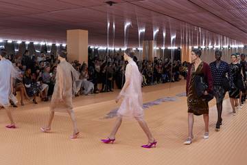 Destacándose como uno de los principales desfiles programados de la tercera jornada de esta edición de septiembre de Milán Fashion Week, la presentación de la colección tenía lugar desde el ya icónico espacio “Deposito” de la Fondazione Prada de Milán. Lugar convertido en el ya habitual recinto desde el que la casa italiana pasa a dar a conocer sus colecciones, y en el que llegaba esta nueva propuesta para tomar el testigo de la colección masculina de Prada presentada, en este mismo lugar, el pasado mes de junio. Una colección aquella sustentada sobre el valor de la “fluidez” aplicado a las nuevas maneras de entender la identidad masculina, y cuyo principio ha pasado igualmente a tomar como propio esta nueva colección de mujer, del mismo modo que no ha dudado en hacerlo de su misma ambientación. Una atmósfera que ha vuelto a llamar poderosamente la atención con sus líquidos fluyendo entre los extremos de la pasarela, en una asimilación que en julio se hacía aproximar a la de ese valor de la “fluidez” masculina, pero para la que ahora parecen darse unas nuevas interpretaciones, más próximas a lecturas que, partiendo de esa misma fluidez para con la identidad de la mujer, vienen para destacar especialmente la propia cualidad de la casa Prada para permanecer tan fiel a sus orígenes, como mutable y capaz de adaptarse a los nuevos ritmos y a las nuevas realidades.