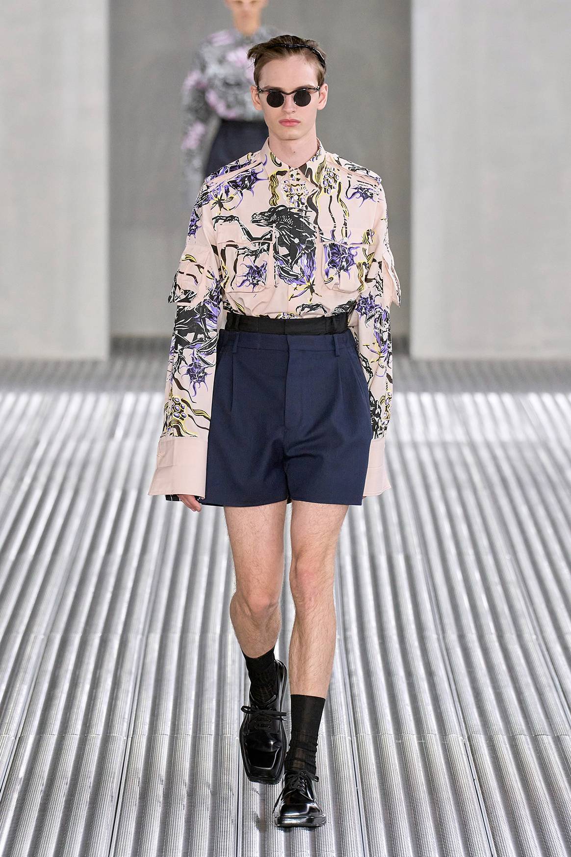 Como fruto de este ejercicio magistral, la casa ha presentado, como piezas clave de esta colección, una serie de trajes sastre que pierden su identidad, reconstituyéndose y “fluyendo” hasta dar paso a una combinación de pantalones cortos y largos, junto a unas chaquetas de corte sastre que se transforman en una sucesión de camisas de sastrería. Mientras que los tradicionales chalecos “utility” también “fluyen” desde su identidad para perder la practicidad de sus bolsillos, presentes aquí a modo de un elemento decorativo más que sirve para terminar de combinar tanto la apariencia de chalecos como camisas. Debiendo a partir de aquí ya entrar a destacar ese universo de inspiraciones florales que también ha pasado a “jugar” como parte de esta colección, en su caso también como motivo desde el que reinventar las implicaciones de un estampado floral, reconstruido aquí igualmente de manera “fluida” y libre, a partir de flecos que ondean al compas de los pasos, o de ramilletes florales que germinan desde la superficie de las prendas.