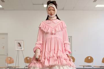 Aún más volumen se exhibió en las colecciones de Viviano Sue. El diseñador, que creció entre Estados Unidos y China, mostró un vestido plateado XXL para su marca Viviano, del que solo emergía la cabeza de la modelo.