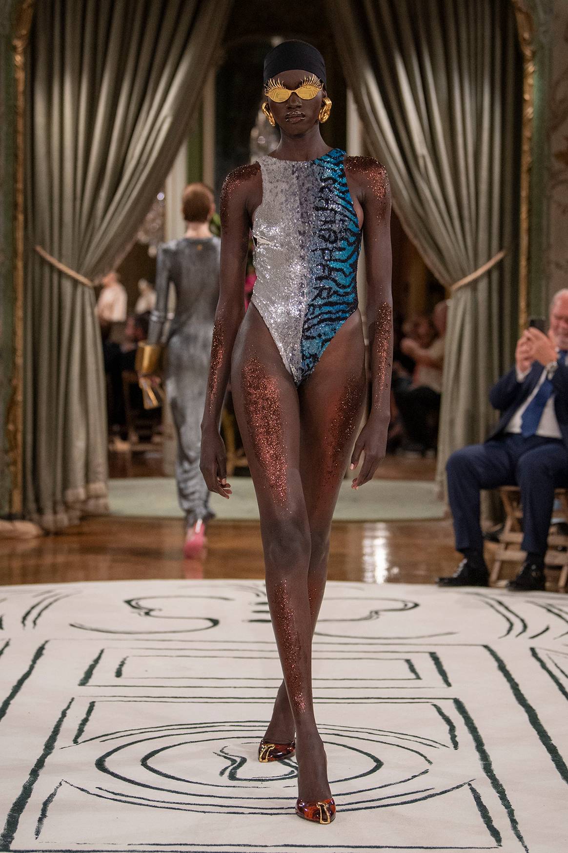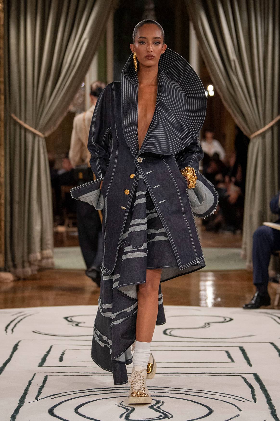 “Me he dado cuenta de que cuanto más familiar es una prenda —una camisa blanca, un trench fluido, un blazer negro ahumado— más agradable es redescubrirla cuando se combina con los códigos de la casa, que a menudo se revelan como secretos” sobre las mismas piezas, valora Roseberry. En esta colección “cada botón de las mangas es una pieza de ‘bijoux’, un eco a la iconografía de la casa, pasada y presente”, como “el ojo de la cerradura, el candado, el ojo, el pezón, la paloma”, o “el motivo de la cinta métrica”. Un recurso que “Elsa estrenó enroscada alrededor de un frasco de perfume con forma de busto para su perfume ‘Shocking’”, y que aquí se muestra perfilando, a modo de bordados, “los bordes tanto de las chaquetas entalladas como de las blusas”. Y es que “el humor inherente a cada parte de nuestra herencia se manifiesta” a lo largo de toda esta colección, pero “ con más fuerza en nuestros dos bolsos favoritos”, el bolso Visage y el nuevo bolso Schiap, así como en “nuestro calzado”. Una categoría esta de la colección que adquiere un valor especialmente representativo, de manos de las nuevas zapatillas deportivas con “garra” metalizada en acabado en oro de que se han presentado como parte de esta nueva propuesta de prêt-à-porter de Schiaparelli. Un nuevo modelo de zapatillas que, apostilla el diseñador texano, tiene “un significado especial para mí porque simboliza quién soy: un abrazo a mi americanidad en un contexto de profundo afrancesamiento”.