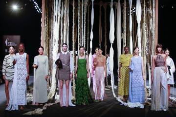 Telas tejidas en jacquard, guipur, organza, rafia y napa, mediante técnicas manuales como trenzados, entrelazados, bordados y anudados, enriquecen la arquitectura de cada atuendo creando conjuntos que se complementan perfectamente en la pasarela con bolsos y accesorios.