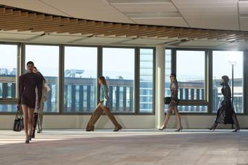 Mujeres ejecutivas, de traje chaqueta gris y anchas hombreras, pero también modelos ultraligeros, de pedrería y transparencias, desfilaron entre sillas, ordenadores y fotocopiadoras en el quinto piso de un edificio de oficinas en el norte de la capital francesa.