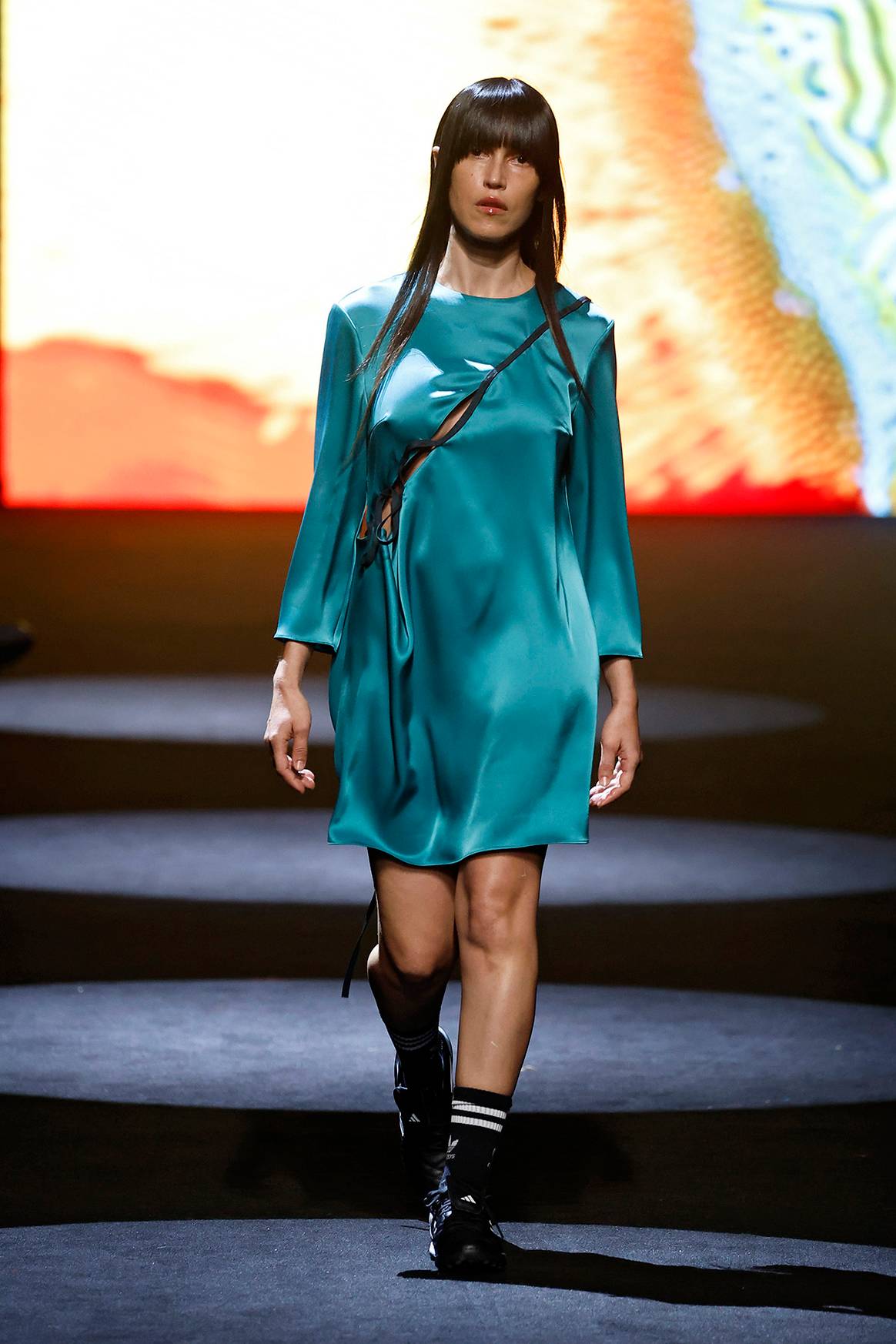 De este modo, y formado parte de este grupo de rostros especialmente conocidos que se han encargado de “alumbrar” el relanzamiento de la casa Berhanyer desde esta nueva edición de MBFW Madrid, se encontraban la actriz Olivia Baglivi, conocida por su papel en “Las niñas de cristal”, y quien desfilaba sobre la pasarela mostrando un estilismo clave de esta colección de relanzamiento, formado por un pantalón mini con exterior de falda y capa, todo ello en verde esmeralda con detalle geométrico en marrón-ocre. Junto a ella, han estado la actriz Nerea Barros, conocida por su papel en “La novia Gitana”, y quien desfiló con un vestido fluido en verde-turquesa con aberturas en tendencia “cut-out” al pecho; la bailarina y actriz Paula Losada, de “La Promesa”, con abrigo geométrico de alpaca en binomio gris-naranja coral; el influencer Ignacio Ayllón, con traje de dos piezas con blazer en línea “overevasé”; y la modelo e influencer Meri Lozano, con vestido-capa de líneas “oversize”. Encargándose de completar este cartel de figuras, de un lado Morte, responsable de mostrar sobre la pasarela el nuevo modelo de traje sastre para hombre de la casa Berhanyer, caracterizado por bolsillos marcados a la cintura y una nueva línea de solapas con la punta abierta en forma de flecha; y del otro Marina Salinas, quien se encargaba de cerrar el desfile mostrando sobre la pasarela un diseño original de Elio Berhanyer de 1962.