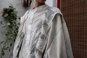 La dupla presentó “Resiliencia”, un proyecto que nació a partir de la búsqueda de la representación de una identidad latinoamericana y sostenible a través del diseño de indumentaria y textil. “Trabajamos con Victoria de manera colaborativa, ella hace tejido en telar con descartes textiles y yo hago indumentaria con foco en lo sostenible. Tuvimos que presentar una minicolección de tres conjuntos que tengan alguna relación con el mundo del arte. Para la primera fase hicimos una especie de manto que está tejido en telar y trabajado con las telas que uso siempre de la cooperativa o remanentes de mi producción, con tintes naturales”, cuenta Escalera.