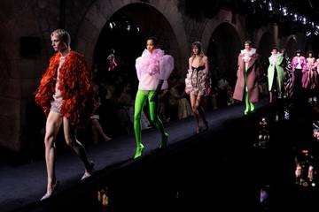 En lo que no podemos dejar de calificar como muestra, una vez más, de un extraordinario ejercicio de virtuosismo, como protagonistas de una tan ficticia como fantástica sala de fiestas en torno a la que parecían haber terminado dándose cita toda la clase posible de irrealidades propias de la Alta Costura, un completo carrusel de vestidos de noche, conjuntos lenceros, trajes, conjuntos, monos y abrigos terminaron por adueñarse de la pasarela durante este desfile de Valentino. Piezas todas ellas que hicieron su aparición bañadas de una amplia paleta cromática inundada de una infinidad de acentos que iban de los intensos rosas fucsia y verdes neón, a la sobriedad de los blancos y los negros, pasando por la vivacidad de naranjas melocotón, amarillos, de rosas en su variedad pastel, de azules, lavandas y rojos, dejando lugar preferente para la iridiscencias de los destellos de los acabados metálicos en platas, dorados y tonalidades champagne. Un colorido universo que se encargaron de completar los fruncidos, las transparencias, los volantes, las plumas, los bordados, los lazos o los apliques iridiscentes, que compartieron protagonismo con la calidad de esa paleta cromática a la hora de dotar de una personalidad única al conjunto de esta propuesta.