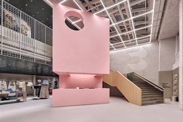 Antes de entrar en mayores detalles sobre esta instalación temporal, en lo que respecta a su distribución espacial, la tienda nos da la bienvenida desde ese vestíbulo de entrada al que hacíamos ya mención, y que desde la cadena guardan por propósito reservar para la presentación de sus últimas colecciones y colecciones cápsula, de mujer. Pasando desde ahí la tienda a desarrollarse a lo largo y ancho de una planta baja a pie de calle que se ha reservado por entero a la exposición de las colecciones de mujer de Bershka; propuestas que se comercializarán desde una planta en la que también se han instalado desde ese gran “cubo rosa” reservado a la zona de cajas asistidas por personal, hasta una zona de cajas de autocobro, un área de probadores, un punto automático para las devoluciones online, un área “Digital fitting room” y, como una de las grandes novedades, a nivel espacial, una nueva zona reservada en exclusiva a las colecciones de calzado, bolsos y complementos. Terminando desde aquí de completarse la tienda, espacialmente y en materia de oferta, desde una primera planta reservada ya a las colecciones de chico de la línea “Bershka Man” de la cadena, planta igualmente dotada de una zona de cajas de autocobro y de probadores.