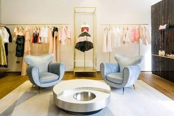 El local de 279 metros cuadrados repartidos en dos plantas se encuentra en el número 134 de Sloane Street, junto a tiendas como Red Valentino o el multimarca Boutique 1. Josep Font ha trabajado directamente en la creación de este espacio de estrilo minimalista con lámparas con forma de hoja de Tommaso Barbi, mesas de los años 70 de Willy Rizzo, sillones de la década de los 40 de terciopelo y el sofá Serpentine de Vladimir Kagan..