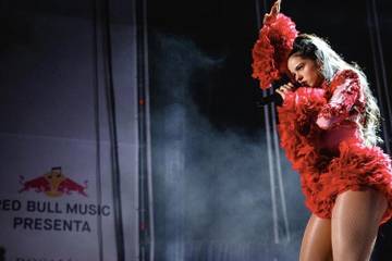 En esta ocasión, el diseño, un body rojo en cuerpo de encaje y pedrería con detalles en la parte inferior y en las terminaciones de las mangas que emulaban los pétalos de una rosa, estaba inspirado en el artwork de Filip Custic para su último single “Di mi nombre” y en la icónica escena del film American Beauty.