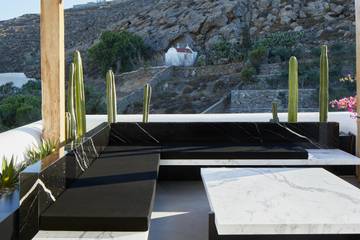 La tienda de Mykonos por su parte está ubicada en el conocido “Nammos Village”, y ha sido diseñada utilizando técnicas locales: las paredes y el suelo están compuestos de tadelakt gris y blanco. Las estructuras de latón niquelado con vidrio vuelven a ser protagonistas y contrastan con una selección de bras de arte africanas únicas y muebles vintage. La tienda cuenta además con una terraza que incluye mesas de mármol blanco y negro y un asiento.