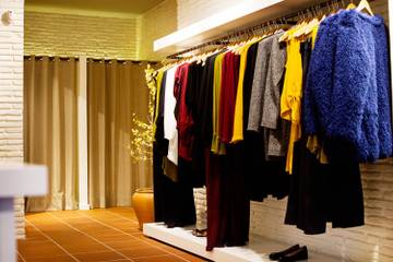 Las paredes y los elementos estructurales pintados de color blanco contrastan con el gres tradicional, las prendas situadas en estructuras que recuerdan las típicas contraventanas de madera conviven con plantas tropicales y macetas de terracota.